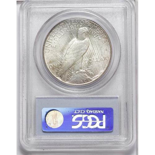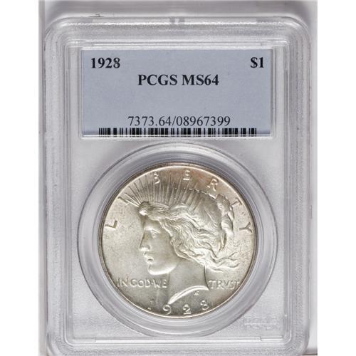<B>1928<img border='0' src='http://www.heritagecoins.com/images/star.gif' width=10 height=10>$1> MS64 PCGS.</B></I> The lowest mintage issue of the standard relief design of Peace dollar. Pleasing surfaces and strike, enhanced by a delicate hint of russet peripheral toning.