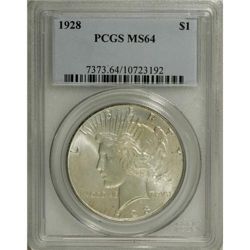 <B>1928 S$1 MS64 PCGS.</B></I> This shimmering chestnut-gold and ice-blue near-Gem has a pleasing strike and an absence of relevant abrasions. The 1928 has less than half the mintage of any other Peace dollar issue.<BR><BR><b>Shipping:</b> Coins & Currency (<a target="_blank" href="http://www.heritageauctions.com/common/shipping.php">view shipping information</a>)