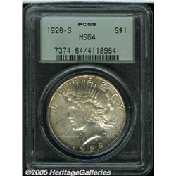 <B>1928-S<img border='0' src='http://www.heritagecoins.com/images/star.gif' width=10 height=10>$1 MS64 PCGS.</B></I> VAM-4. Luster blazes across the honey and pearl-gray surfaces. A typically struck near-Gem that has a clean portrait and is certified in a green label holder. The TR in TRVST and the designer's monogram are die doubled.