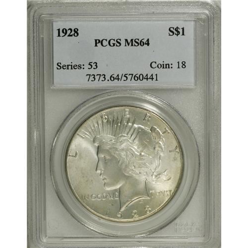 <B>1928 S$1 MS64 PCGS.</B></I> Well struck and lustrous, with shimmering silver-gray surfaces that reveal a slight degree of gold toning near the periphery. A few small abrasions are noted on each side.<BR><BR><b>Shipping:</b> Coins & Currency (<a target="_blank" href="http://www.heritageauctions.com/common/shipping.php">view shipping information</a>)