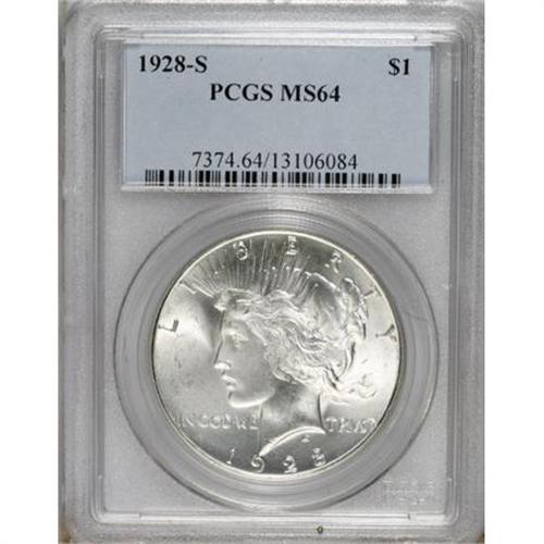 <B>1928-S $1 MS64 PCGS.</B></I> This brilliant and lustrous better date near-Gem has a good strike and a smooth cheek. The neck and fields display light grazes. LIBERTY is strike doubled.<BR><BR><b>Shipping:</b> Coins & Currency (<a target="_blank" href="http://www.heritageauctions.com/common/shipping.php">view shipping information</a>)