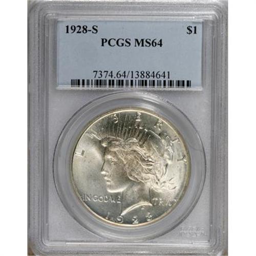 <B>1928-S $1 MS64 PCGS.</B></I> <B>1928-S S$1 MS64 PCGS.</B></I> Light golden-brown freckles enrich this lustrous better date Peace dollar. Liberty's cheek is exceptionally smooth, and the strike is crisp save for the mintmark.<BR><BR><b>Shipping:</b> Coins & Currency (<a target="_blank" href="http://www.heritageauctions.com/common/shipping.php">view shipping information</a>)