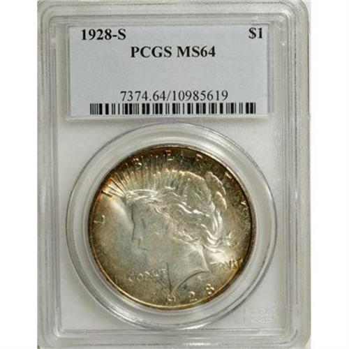 <B>1928-S $1 MS64 PCGS.</B></I> <B>1928-S S$1 MS64 PCGS.</B></I> Lustrous with above-average striking detail. Light orange and aqua toning laps at the reverse rims, while bands of crimson, peach, and sky-blue surround the untoned center of the obverse.<BR><BR><b>Shipping:</b> Coins & Currency (<a target="_blank" href="http://www.heritageauctions.com/common/shipping.php">view shipping information</a>)