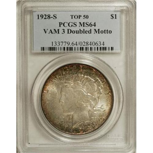 <B>1928-S $1 MS64 PCGS.</B></I> VAM-3. A Top 50 Variety. A later die state example of this popular "Doubled Motto" variety, with strong spread visible on the first T of TRUST. Modestly marked overall with gold, orange, and golden-brown colors at the margins and cloud-gray patina over the rest of this well struck and lustrous piece. Population: 6 in 64, 0 finer (4/07).<BR><BR><b>Shipping:</b> Coins & Currency (<a target="_blank" href="http://www.heritageauctions.com/common/shipping.php">view shipping information</a>)