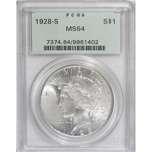 <B>1928-S $1 MS64 PCGS.</B></I> VAM-3. A Top 50 Variety. The low mintmark, doubled motto VAM. Collectors neglected the 1928-S dollar at first, focusing on its P-mint counterpart. Today, in Choice and better grades, the branch mint pieces command higher prices. This well-defined piece exhibits pale gray patina over both sides. Minimally marked with strong luster beneath. Housed in a green label holder.<BR><BR><b>Shipping:</b> Coins & Currency (<a target="_blank" href="http://www.heritageauctions.com/common/shipping.php">view shipping information</a>)