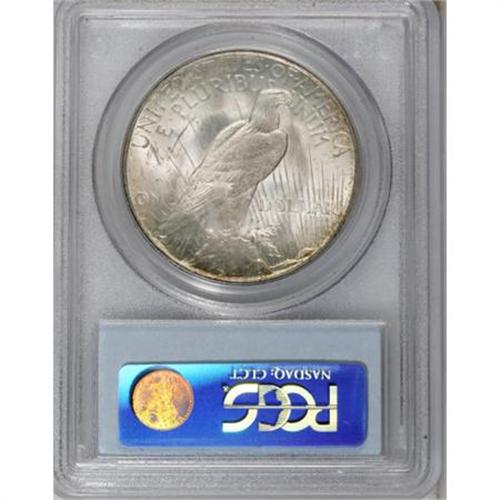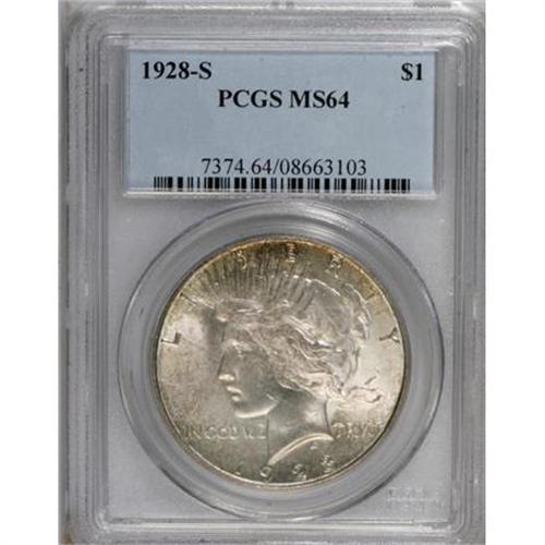 <B>1928-S $1 MS64 PCGS.</B></I> A strongly lustrous and well struck dollar, predominantly silver-gray with elements of gold and orange patina at the margins. A lone abrasion on the jawline precludes the Gem designation. This prominent Peace issue is elusive any finer, with only 47 such coins certified by PCGS (9/07).<BR><BR><B>Coin Engraver:</B> Anthony de Francisci<BR><BR><b>Shipping:</b> Coins & Currency (<a target="_blank" href="http://www.heritageauctions.com/common/shipping.php">view shipping information</a>)