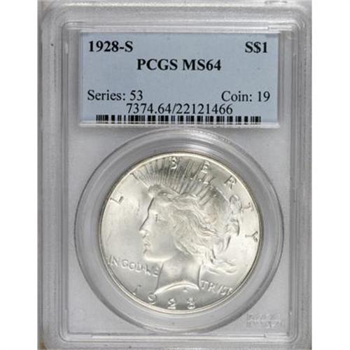 <B>1928-S $1 MS64 PCGS.</B></I> VAM-4. A lustrous and virtually brilliant silver dollar without any significant marks. Die doubled on the central letters in IN GOD WE TRUST, as often seen on this low mintage and conditionally scarce issue.<BR><BR><B>Coin Engraver:</B> Anthony de Francisci<BR><BR><b>Shipping:</b> Coins & Currency (<a target="_blank" href="http://www.heritageauctions.com/common/shipping.php">view shipping information</a>)