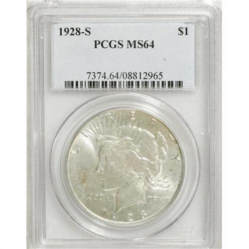 <B>1928-S $1 MS64 PCGS.</B></I> VAM-3. A Top 50 Variety. WE TRUST is die doubled, and the mintmark position is low, diagnostic of this popular VAM. The cheek, neck, and obverse field are smooth. The light tan toning is more apparent on the obverse. The 1928-S is among the most difficult issues to locate in MS65.<I><BR>Selections From <a href="http://www.pcgs.com/setregistry/alltimeset.aspx?s=32891" target=_new>Gobrecht's Raisinet Collection</a>, the #1 Finest PCGS Registry Copper, Nickel and Silver Type Set.</B></I><BR><BR><B>Coin Engraver:</B> Anthony de Francisci<BR><BR><b>Shipping:</b> Coins & Currency (<a target="_blank" href="http://www.heritageauctions.com/common/shipping.php">view shipping information</a>)