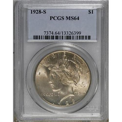 <B>1928-S $1 MS64 PCGS.</B></I> The lovely champagne-gold toning is imbued with elements of speckled reddish-apricot patina. Highly lustrous and boldly struck, with minimal marks, this piece seems conservatively graded as a near-Gem. A challenging semi-key date in the series. <BR><BR><B>Coin Engraver:</B> Anthony de Francisci<BR><BR><b>Shipping:</b> Coins & Currency (<a target="_blank" href="http://www.heritageauctions.com/common/shipping.php">view shipping information</a>)