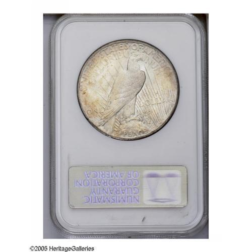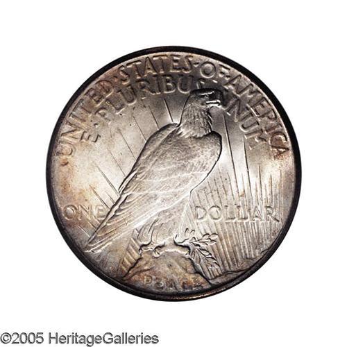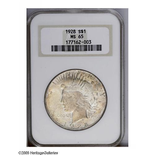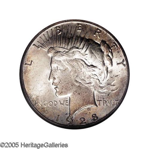 <B>1928<S$1> MS65 NGC.</B></I> Another key-date coin that collectors search for unceasingly at coin shows and that dealers always seem to have just sold out of. This example has beautiful original transparent copper-gold toning with a hint of blue that covers the obverse and reverse. The cheek of Liberty is extremely clean. A tick through the hair and a light scrape through the eagle's wing, noticed only with a loupe, are consistent with the grade and mentioned only for accuracy. Virtually unimprovable, as NGC has graded only a single coin finer (12/05).
