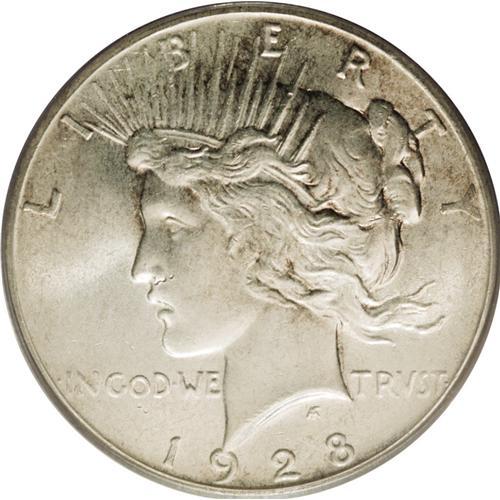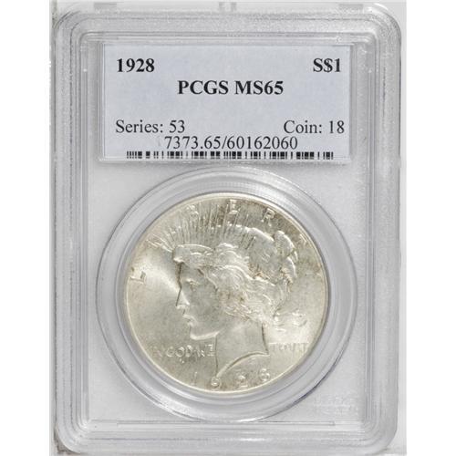 <B>1928<img border='0' src='http://www.heritagecoins.com/images/star.gif' width=10 height=10>$1> MS65 PCGS.</B></I> A satiny Gem with excellent eye appeal created through a combination of faint gold toning on ivory surfaces. Both sides are sharply defined with limited abrasions that are strictly consistent with the grade. An important key-date issue, this date is seldom found in higher grades with only 11 finer examples certified by PCGS (8/06).