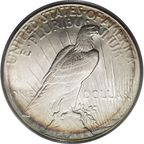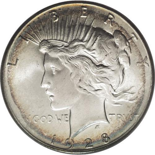 <B>1928 S$1 MS65 PCGS.</B></I> Both sides of this sharply struck Gem have satiny silver luster that is framed by peripheral gold and iridescent toning. The surfaces are remarkably free of blemishes. Not even the smallest surface marks are evident without magnification. Although other dates in the series have lower populations in Gem quality, the 1928 Peace dollar has long been considered the key-date to this series. PCGS has only graded 11 finer examples (4/07).<BR><BR><b>Shipping:</b> Coins & Currency (<a target="_blank" href="http://www.heritageauctions.com/common/shipping.php">view shipping information</a>)