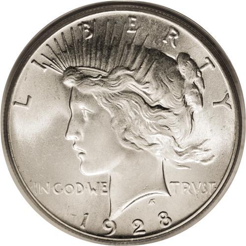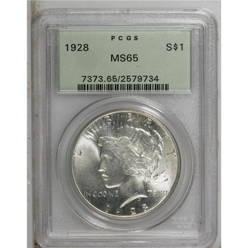 <B>1928<img border='0' src='http://www.heritagecoins.com/images/star.gif' width=10 height=10>$1> MS65 PCGS.</B></I> This splendid Gem has a delicate overlay of chestnut and ice-blue patina. Cartwheel luster dominates, and the strike is good although the centers show a trace of softness. The obverse is particularly smooth. A popular low mintage date, encapsulated in a green label holder.