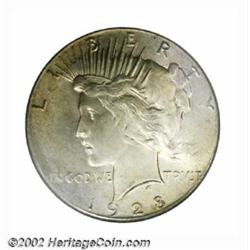 1928 S$1 MS65 PCGS. With the exception of the High Relief 1922 (which has yet to be confirmed in business strike format), the 1928 boasts the lowest mintage (360,649 pieces) in the entire 1921-1935 Peace Dollar series. Mint State examples, while not rare in an absolute sense, are always in demand. We do note, however, that precious few Uncirculated 1928 Dollars grade as fine as MS65. This is just such a coin, and both sides are well above average in terms of striking quality. A little softness of detail, nonetheless, is noted in the centers, but this feature pales in comparison to the smooth, distraction-free surfaces and full mint luster. Dappled sandy-gold patina overlays both sides of this important example. Important notice: We expect to be auctioning lots at the rate of 200-250 per hour. Sometimes eBay Premier live bid software cannot keep up with that pace, so we strongly recommend that you place a realistic proxy bid now as insurance to avoid disappointment. Also please note that all Heritage/CAA lots purchased through eBay Premier carry a 20% Buyer's Premium. Please make sure you read the Terms and Conditions.