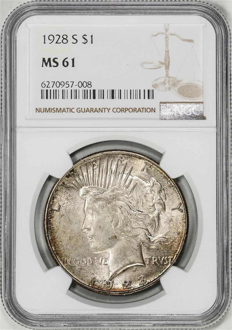 One 1928-S $1 Peace Silver Dollar Coin NGC MS61. NGC Certified.