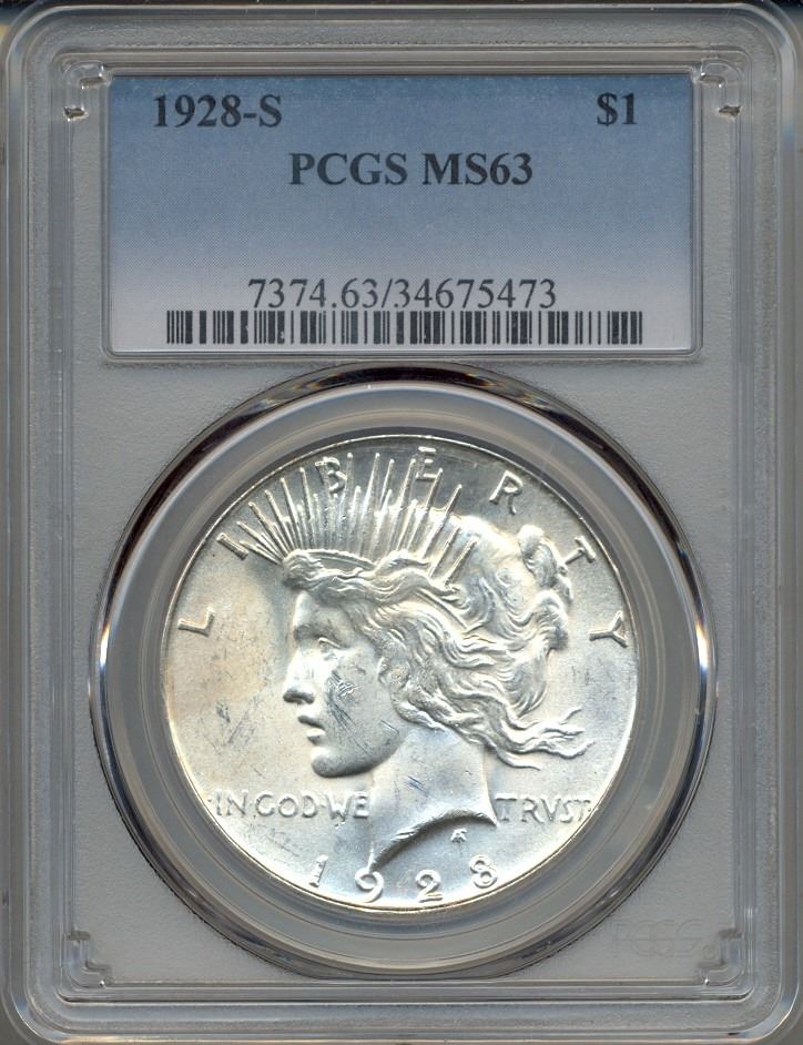 One 1928-S $1 Peace Silver Dollar Coin PCGS MS63.