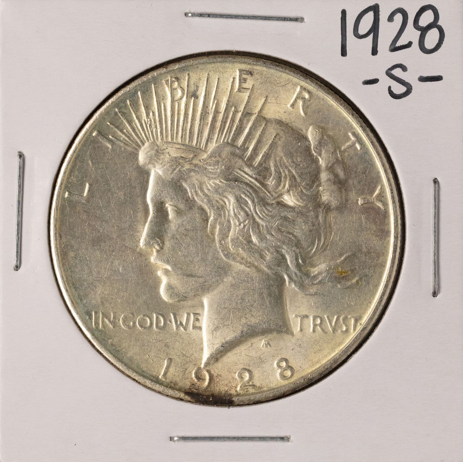 One 1928-S $1 Peace Silver Dollar Coin.