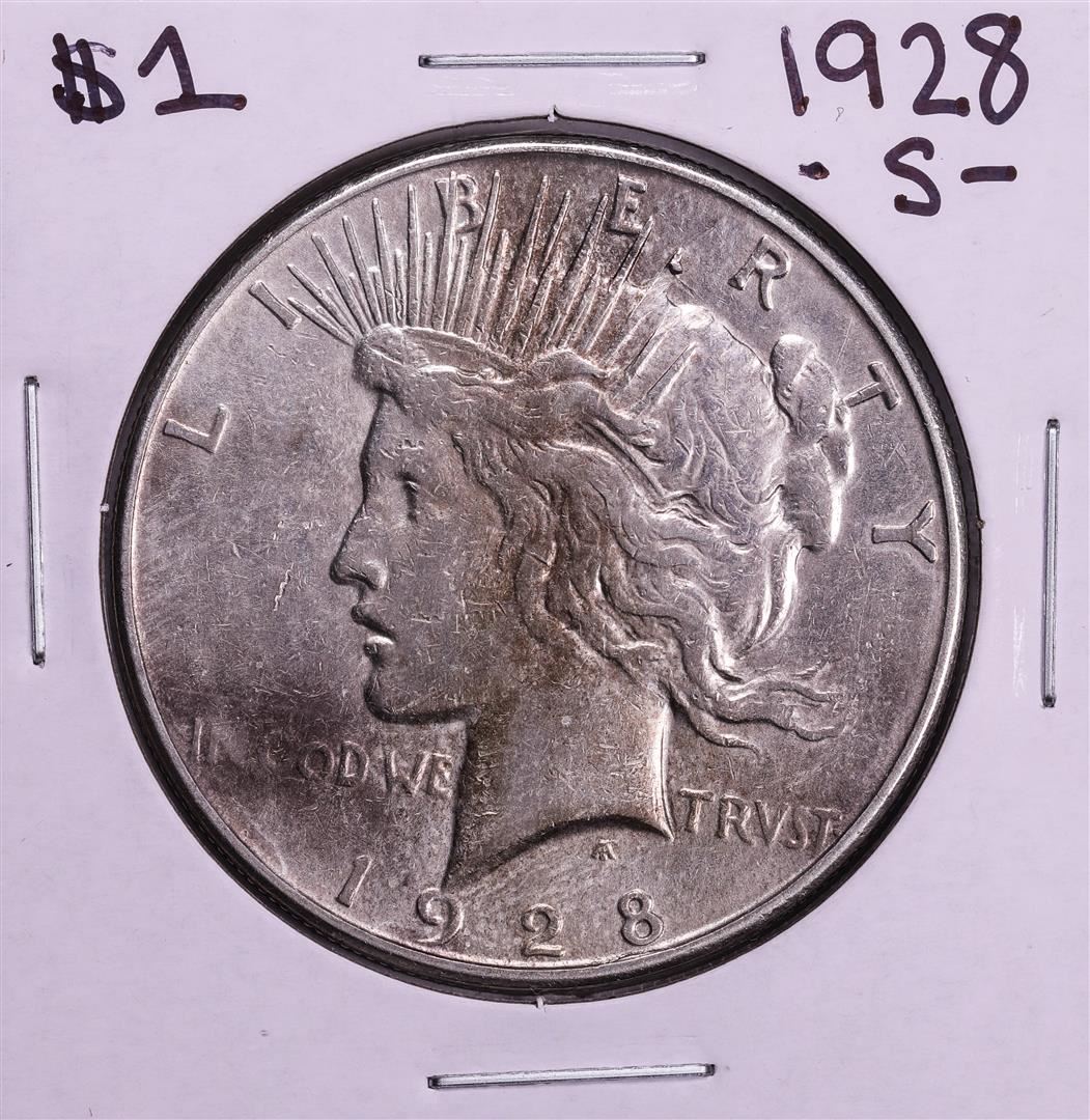 One 1928-S $1 Peace Silver Dollar Coin.