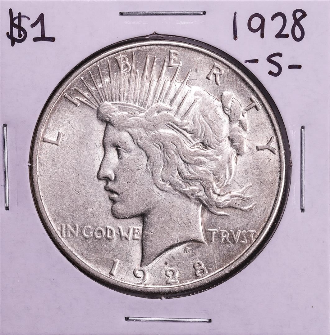 One 1928-S $1 Peace Silver Dollar Coin.