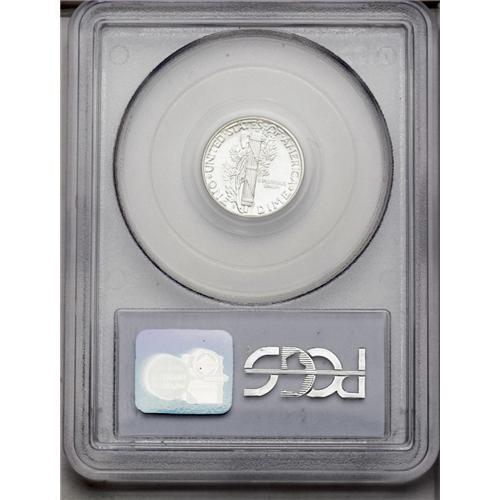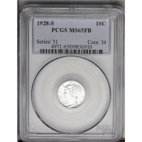 <B>1928-S<10C> MS65 Full Bands PCGS.</B></I> Brilliant and prooflike, with a small obverse blindingly mirrored patch behind Liberty's head that shows what David Lange calls "die burn" from zealous die overpolishing. There is no trace of toning. The crucial central bands are fully split all along their length, and the diagonals are full. The lower diagonal shows a single tick, as frequently seen in its exposed position. PCGS has graded 35 coins finer (4/06).