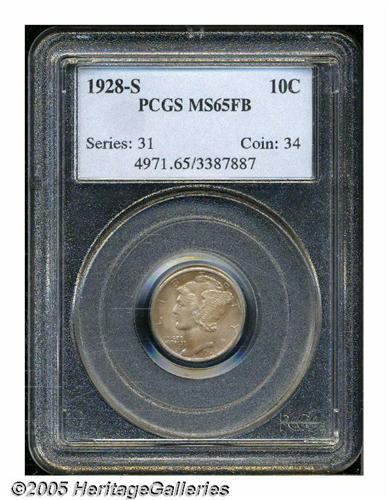<B>1928-S<10C> MS65 Full Bands PCGS.</B></I> Fully struck with a pleasing mixture of rose and mint-green toning over the two sides, satin luster, and expertly preserved surfaces that seem pristine. While not in the same league as the earlier S-mints from the 1920s, the 1928-S is, nevertheless, a scarcer item in Gem, fully struck (Full Bands) condition. Population: 57 in 65 Full Bands, 33 finer (6/05).