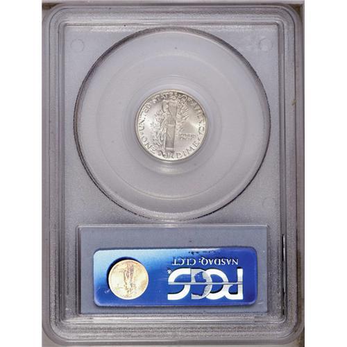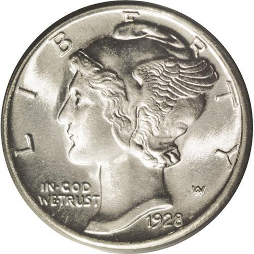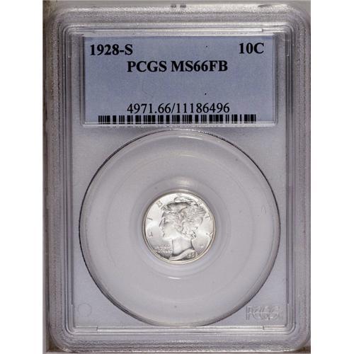<B>1928-S<10C> MS66 Full Bands PCGS.</B></I> Macro S. Breen-3631. Both sides of this sparkling Premium Gem are bright and completely untoned in appearance. The technical quality of this piece is accurately indicated by the assigned grade. It seems likely that, while the Macro S variety is probably scarcer from the standpoint of total number of pieces known, a small group of high grade examples were preserved either deliberately or, more likely, by chance. This is the only S-mint issue in the Mercury dime series that displays this style mintmark. Population: 29 in 66, 6 finer (4/06).