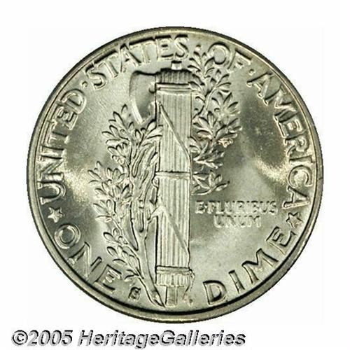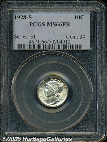 <B>1928-S<10C> MS66 Full Bands PCGS.</B></I> Macro S. Breen-3631. Both sides of this sparkling Gem are bright and generally untoned in appearance. The surfaces do, however, reveal a subtle golden cast at certain angles. The technical quality of this piece is accurately indicated by the assigned grade. It seems likely that, while the Macro S variety is probably scarcer from the standpoint of total number of pieces known, a small group of high grade examples were preserved either deliberately or, more likely, by chance. This is the only S-mint issue in the Mercury Dime series that displays this style mintmark. Population: 27 in 66, 5 finer (4/05).
