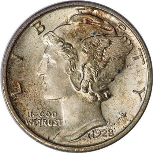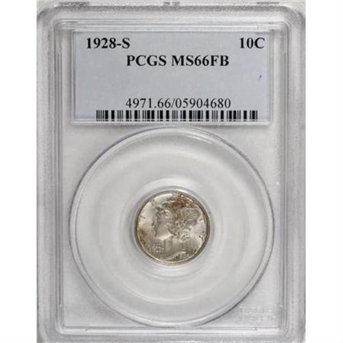 <B>1928-S 10C MS66 Full Bands PCGS.</B></I> David Lange (2005) writes that 1928-S dimes were better made than most products of the San Francisco Mint during the 1920's, "though examples having full bands form a minority of the surviving Uncirculated population." The Premium Gem Full Bands specimen in this lot is thus a special offering, having been the recipient of a powerful strike. Highly lustrous, lightly toned, well preserved surfaces add to the overall eye appeal. Population: 28 in 66 Full Bands, 7 finer (8/07).<BR><BR><B>Coin Engraver:</B> Adolph A. Weinman<BR><BR><b>Shipping:</b> Coins & Currency (<a target="_blank" href="http://www.heritageauctions.com/common/shipping.php">view shipping information</a>)
