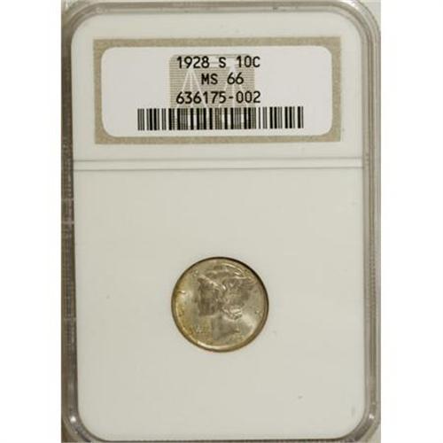 <B>1928-S 10C MS66 NGC.</B></I> NGC Census: (34/7). PCGS Population (29/2). Mintage: 7,400,000. Numismedia Wsl. Price for NGC/PCGS coin in MS66: $442. (#4970)<BR><BR><B>Coin Engraver:</B> Adolph A. Weinman<BR><BR><b>Shipping:</b> Coins & Currency (<a target="_blank" href="http://www.heritageauctions.com/common/shipping.php">view shipping information</a>\)