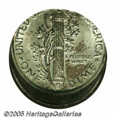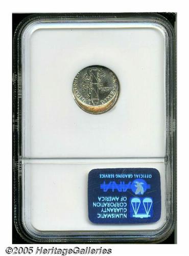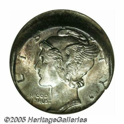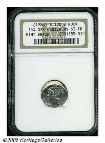 <B>1928-S<10C> Mercury Dime--Struck 15% Off Center--MS63 Full Bands NGC.</B></I> Blushes of mauve color enrich this lustrous and well preserved example. Struck off center toward 6 o'clock, the date is partly off the flan although enough of the digits are present to confirm its status as a 1928-S. The lower reverse has a raised flange, as made, where the piece partly wrapped around the reverse die.
