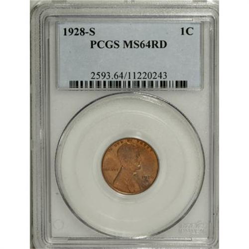 <B>1928-S 1C MS64 Red PCGS.</B></I> PCGS Population (139/45). NGC Census: (31/7). Mintage: 17,266,000. Numismedia Wsl. Price for NGC/PCGS coin in MS64: $380. (#2593)<BR><BR><b>Shipping:</b> Coins & Currency (<a target="_blank" href="http://www.heritageauctions.com/common/shipping.php">view shipping information</a>)