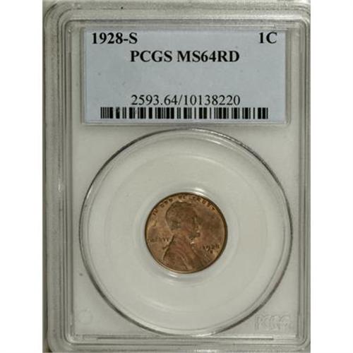 <B>1928-S 1C MS64 Red PCGS.</B></I> This piece is well struck for the issue and shows orange-red surfaces with some light carbon. A charcoal streak is noted through the O of ONE. Seldom found in full Red, and perhaps underrated as such.<BR><BR><B>Coin Engraver:</B> Victor D. Brenner<BR><BR><b>Shipping:</b> Coins & Currency (<a target="_blank" href="http://www.heritageauctions.com/common/shipping.php">view shipping information</a>)