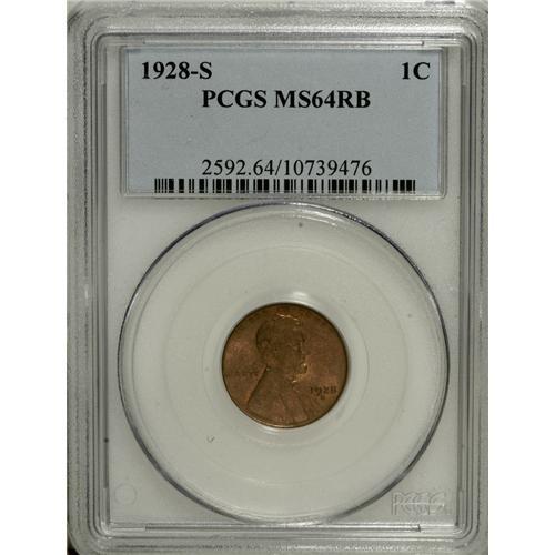 <B>1928-S 1C MS64 Red and Brown PCGS.</B></I> PCGS Population (91/2). NGC Census: (61/20). Mintage: 17,266,000. Numismedia Wsl. Price: $175. (#2592)<BR><BR><b>Shipping:</b> Coins & Currency (<a target="_blank" href="http://www.heritageauctions.com/common/shipping.php">view shipping information</a>)