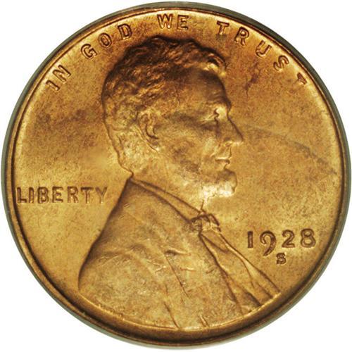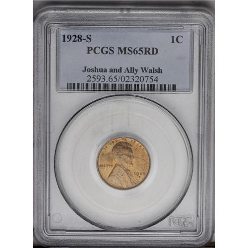 <B>1928-S<1C> MS65 Red PCGS.</B></I> Ex: Joshua and Ally Walsh. This well struck Gem is mostly fire-red, aside from a thin steel-gray streak on the right obverse field. A few tiny ticks are concealed on ONE CENT. The 1928-S is one of many conditional rarities among branch mint issues from the twenties; available in toned Mint State but elusive with full Red. Population: 40 in 65, 5 finer (4/06).