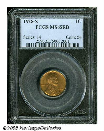 <B>1928-S<1C> MS65 Red PCGS.</B></I> Surprisingly well struck with some detail even showing on Lincoln's beard. The surfaces overall are a bright golden-red with no distracting carbon or discoloration on either side. A small patch of surface roughness, of undetermined origin, is seen in the right obverse field. Conditionally scarce as a Gem, with full Red color. Population: 39 in 65 Red, 5 finer (6/05).<BR><I>From The William Bickel Collection, Part One.</B></I>