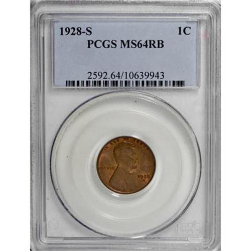 <B>1928-S 1C MS64 Red and Brown PCGS.</B></I> PCGS Population (93/2). NGC Census: (62/20). Mintage: 17,266,000. Numismedia Wsl. Price for NGC/PCGS coin in MS64: $175. (#2592)<BR><BR><B>Coin Engraver:</B> Victor D. Brenner<BR><BR><b>Shipping:</b> Coins & Currency (<a target="_blank" href="http://www.heritageauctions.com/common/shipping.php">view shipping information</a>)