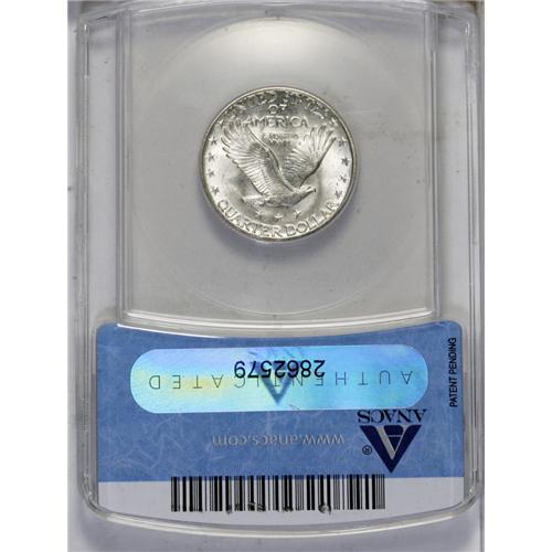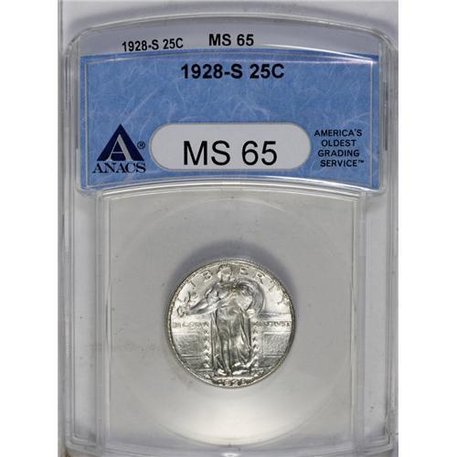<B>1928-S<25C> MS65 ANACS.</B></I> Small S. Only a trace of gold toning denies full brilliance. Booming luster and a clean obverse confirm the grade. The center of the head is soft, but the date and mintmark are sharp. The reverse field has a few trivial grazes.