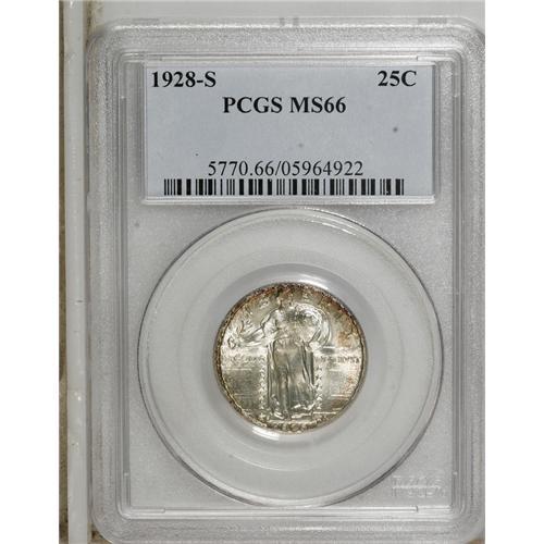 <B>1928-S 25C MS66 PCGS.</B></I> A radiant frosty sheen is displayed on both sides of this beautiful Premium Gem. The untoned silver centers are framed by lovely russet and sea-green peripheral toning. Close to Full Head status, the overall quality of this piece is outstanding.<BR><BR><b>Shipping:</b> Coins & Currency (<a target="_blank" href="http://www.heritageauctions.com/common/shipping.php">view shipping information</a>)