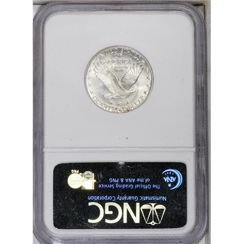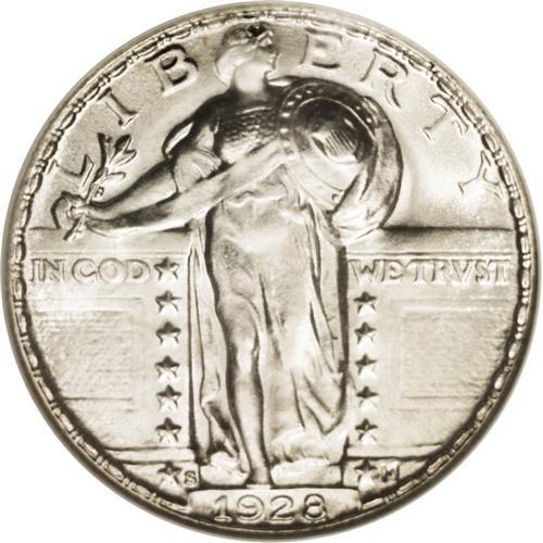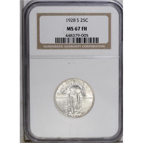 <B>1928-S<25C> MS67 Full Head NGC.</B></I> This appears to be the Small S variety, a mintmark variant that is several times scarcer than the usually seen Large S, with the mintmark distant from the adjacent star. Superb overall quality, the surfaces are brilliant throughout and heavily frosted with no abrasions to interrupt the flow of luster around each side. Census: 18 in 67, 0 finer (9/06).