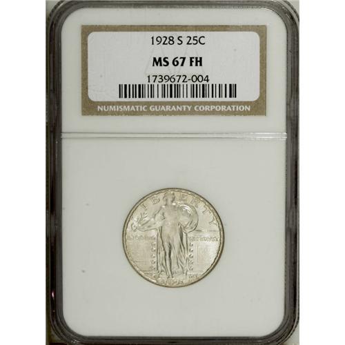 <B>1928-S 25C MS67 Full Head NGC.</B></I> The 1928-S is one of the more commonly encountered late-date issues. This example is an impeccable snow-white Superb Gem that is boldly defined throughout, not just on the rather isolated highpoint of Liberty's head. Just a couple of the lower rivets are a trifle soft. Rich mint luster swirls around both sides. A couple of minute marks on Liberty's lower right leg are mentioned for accuracy. Census: 18 in 67, 0 finer (12/06).<BR><BR><b>Shipping:</b> Coin/Currency (<a target="_blank" href="http://www.heritageauctions.com/common/shipping.php">view shipping information</a>)