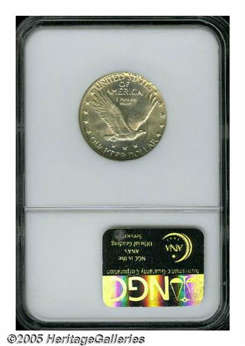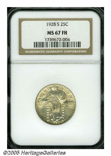 <B>1928-S<25C> MS67 Full Head NGC.</B></I> The 1928-S is one of the more commonly encountered late-date issues. The mintage was 2.64 million pieces, but as one would expect, high grade examples such as this one are seldom encountered. Only 13 other MS67 pieces with Full Head have been graded by NGC and seven by PCGS, with none finer at either service (6/05). This example is an impeccable snow-white Superb Gem that is boldly defined throughout, not just on the rather isolated highpoint of Liberty's head. Just a couple of the lower rivets are a trifle soft. Rich mint luster swirls around both sides. A couple of minute marks on Liberty's lower right leg are mentioned for accuracy.