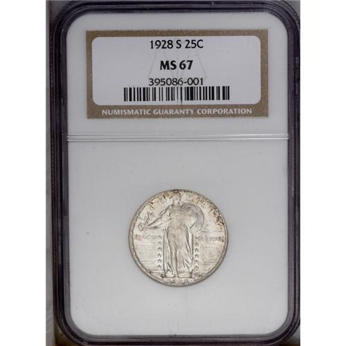 <B>1928-S 25C MS67 NGC.</B></I> The surfaces of this lovely Superb Gem are virtually mark-free, and the luster is thick and frosted on the reverse, satiny and smooth on the obverse, with just the faintest outline of russet patina around the rims, and splashes of olive color in the lower reverse fields. Liberty's head shows an adequate amount of detail for a "non FH" variety. An appealing and highly desirable offering, with no example of the issue graded higher (aside from several MS67 Full Head pieces) by either major certification service.