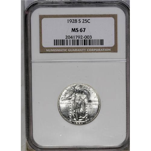 <B>1928-S<25C> MS67 NGC.</B></I> This stunning Superb Gem representative radiates dazzling luster from essentially untoned and impeccably preserved surfaces. While not quite a Full Head, a good portion of the detail is there. Indeed, except for softness in a couple of the lower rivets, the design elements are well brought up. A few minor handling marks on the right gate are not bothersome. NGC and PCGS combined have certified a mere twelve coins in this lofty grade, and none finer (6/06)!