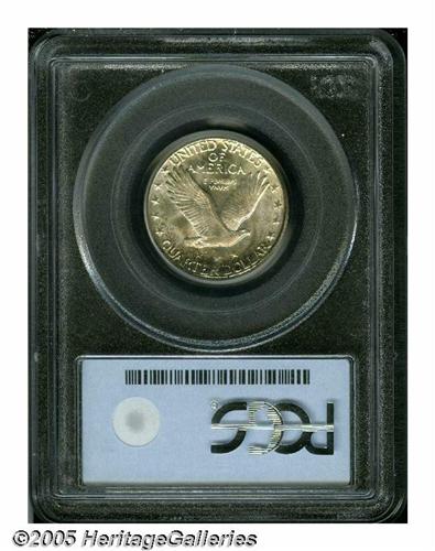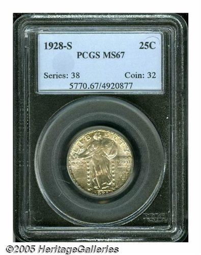 <B>1928-S<25C> MS67 PCGS.</B></I> Intense silver luster is accented by pale lilac splashes. Although the mintage of 2,644,000 coins suggests that this is a rather common issue, few survivors can equal the present "keeper." This Superb Gem is not a full head; however, is very nearly so. In fact, only the immediate center of Liberty's head is weak, limited strictly to her ear and cheek.