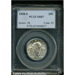 <B>1928-S<25C> MS67 PCGS.</B></I> Intense silver luster is accented by pale heather and iridescent splashes. Although the mintage of 2,644,000 coins suggests that this is a rather common issue, few survivors can equal the present "keeper." This Superb Gem is not a full head; however, is very nearly so. In fact, only the immediate center of Liberty's head is weak, limited strictly to her ear and cheek. Population: 2 in 67, 0 finer (7/04). Seven others have been certified as MS67FH. <BR><BR><B>Important notice:</B> Heritage usually auctions material at the rate of 200-250 lots per hour. On some occasions eBay Live bid software or the Internet may not be able to keep up with the pace of the auction. We recommend placing a realistic absentee bid now as insurance to avoid disappointment. Occasionally the auctioneer may eliminate or reject an eBay Live bid, and the auctioneer may also reopen a lot after the close of the eBay live bidding (usually because we missed an audience bid), and may reject your bid even if it shows you as the winning bidder. By bidding via eBay Live, you agree that Heritage may award the lot to another bidder at its sole discretion under the circumstances described above or any other reasonable circumstances. Since eBay bids are not shown to us until we open the lot on the floor, we treat those bids just like floor bids. In most cases the floor responds before the eBay bid is presented to us, due to Internet lag time, so for consistency we have made it a policy that floor bids are always considered first over tie eBay live bids. Also please note that all Heritage lots purchased through eBay Live carry a 20% Buyer's Premium. Please make sure you read the Terms and Conditions before you bid. </span></font></tr></table></td></tr></table>