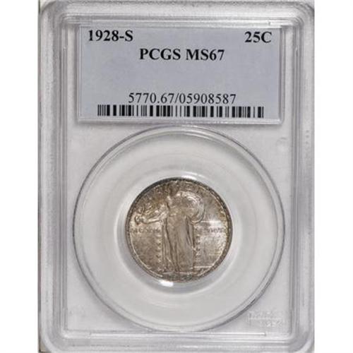 <B>1928-S 25C MS67 PCGS.</B></I> Well struck overall with lovely luster beneath waves of dappled orange, violet, and silver-blue patina. A lovely Superb Gem survivor from this surprisingly elusive San Francisco issue. Population: 3 in 67, 0 finer (12/07).<BR><BR><B>Coin Engraver:</B> Hermon A. MacNeil<BR><BR><b>Shipping:</b> Coins & Currency (<a target="_blank" href="http://www.heritageauctions.com/common/shipping.php">view shipping information</a>)