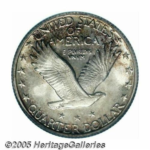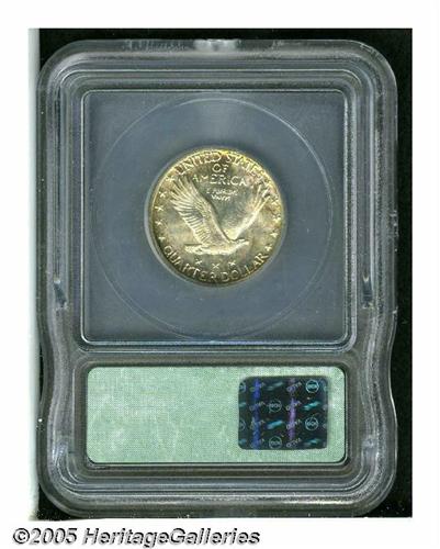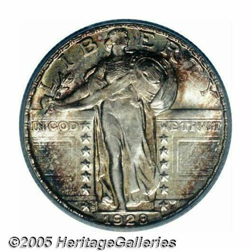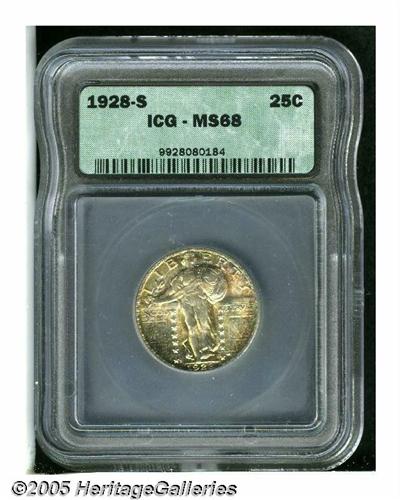 <B>1928-S<25C> MS68 ICG.</B></I> A simply gorgeous Quarter for the toning enthusiast, both sides display crimson-russet, electric-blue, and sea-green peripheral toning that is markedly more vibrant on the obverse. Smooth, frosty luster forms a splendid backdrop to this color scheme, nearly abrasion-free features are also evident beneath the toning. An impressive Standing Liberty Quarter irrespective of date, the 1928-S is also a difficult coin to locate in the finer Mint State grades.