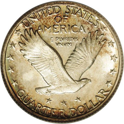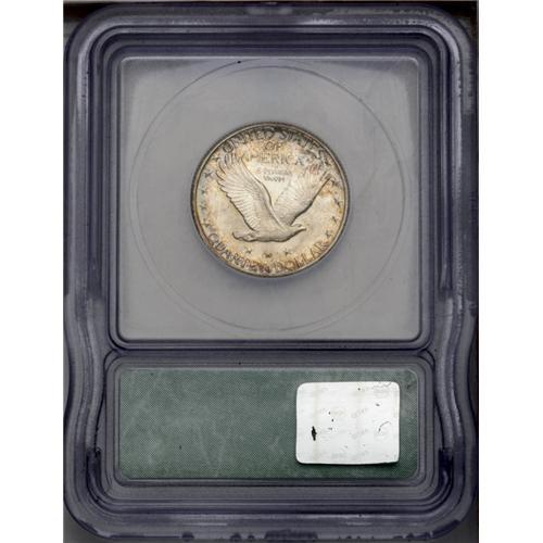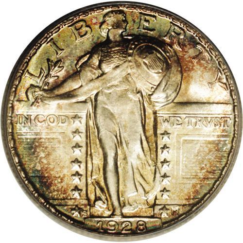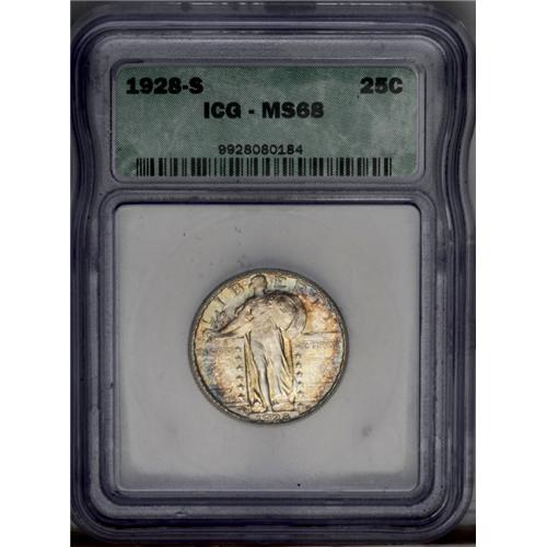 <B>1928-S<25C> MS68 ICG.</B></I> A simply gorgeous Quarter for the toning enthusiast, both sides display crimson-russet, electric-blue, and sea-green peripheral toning that is markedly more vibrant on the obverse. Smooth, frosty luster forms a splendid backdrop to this color scheme, nearly abrasion-free features are also evident beneath the toning. An impressive Standing Liberty Quarter irrespective of date, the 1928-S is also a difficult coin to locate in the finer Mint State grades.