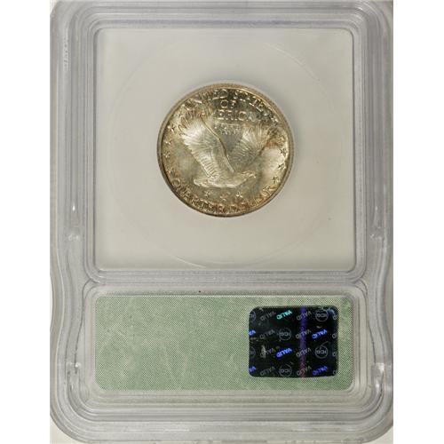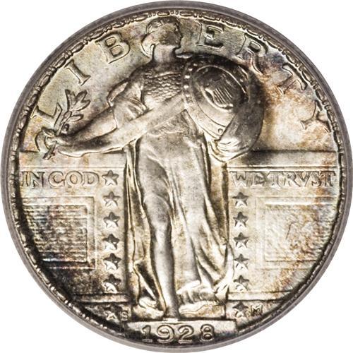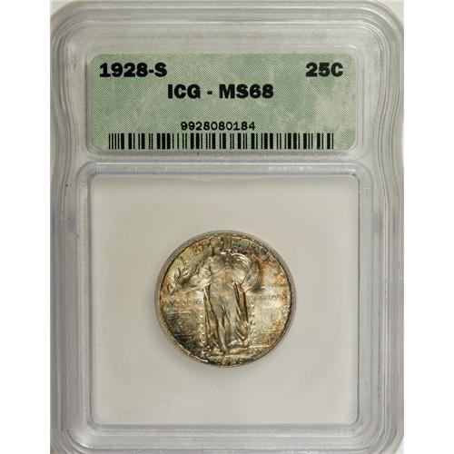 <B>1928-S 25C MS68 ICG.</B></I> A simply gorgeous quarter for the toning enthusiast. Both sides display crimson-russet, electric-blue, and sea-green peripheral toning that is markedly more vibrant on the obverse. Smooth, frosty luster forms a splendid backdrop to this color scheme. Nearly abrasion-free features are evident beneath the toning. This would be an impressive Standing Liberty quarter regardless of date, but the 1928-S is a difficult coin to locate in finer Mint State grades.<BR><BR><b>Shipping:</b> Coins & Currency (<a target="_blank" href="http://www.heritageauctions.com/common/shipping.php">view shipping information</a>)