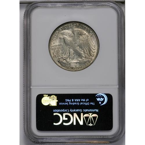 <B>1928-S<50C> AU58 NGC.</B></I> Softly struck in the centers, with dove-gray toning augmented by speckled red-brown and turquoise-blue patina near the borders. Even highpoint wear prevents a Mint State grade assessment.